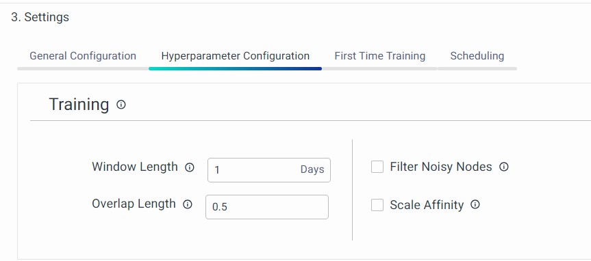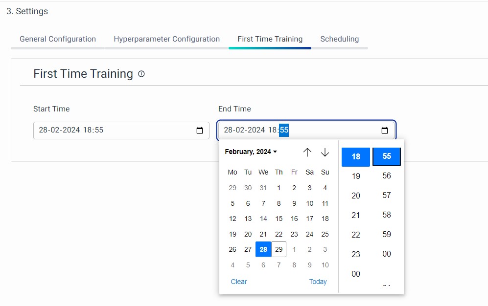 This is the third section of the Settings page. You must choose the start time and end time of the data that must be utilized to train the algorithm.