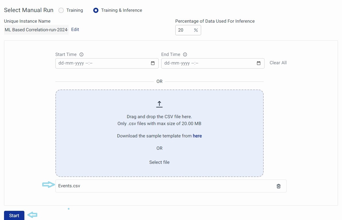 Choose the ‘Start Time’ and ‘End Time’ within which events will be considered for Training or Training and Inference. Click on the Start button to begin. If you choose Training and Inference, choose the percentage of the Data used for Inference.