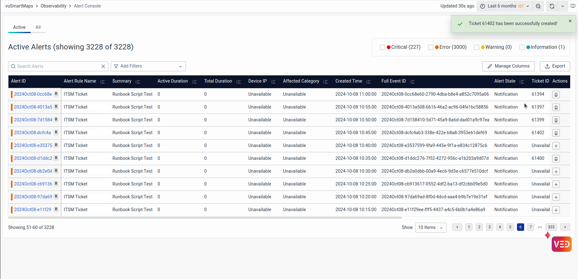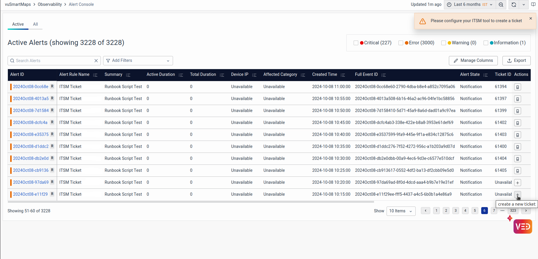 - Actions: The tickets can be managed by creating a new one or viewing an existing one. For more details, refer to Managing Alert Page Tickets.