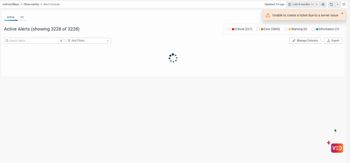 vuSmartMaps Alert Console can be accessed by navigating from the left navigation menu (Observability > Alert Console).