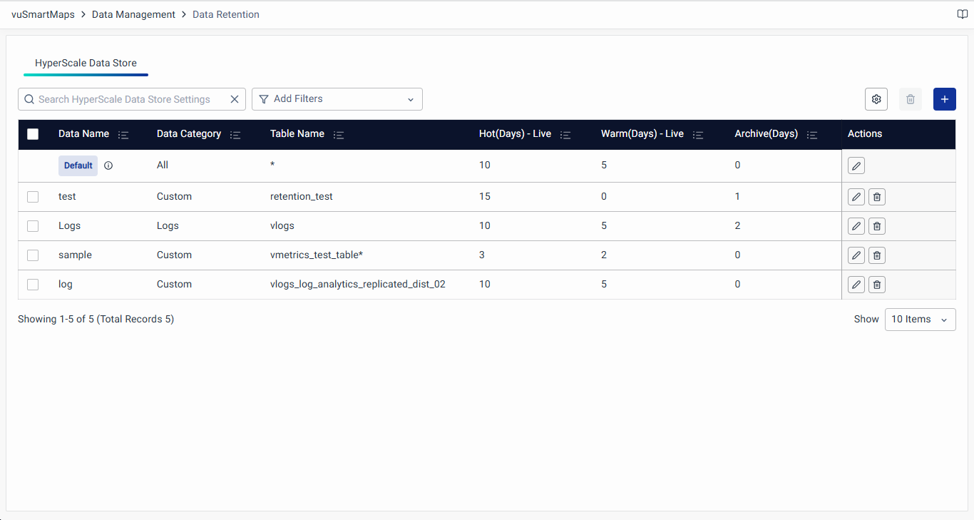 Upon accessing the Data Retention page, you will land on the default tab for HyperScale Data Store Retention Settings. The landing page lists, the following details for the configured data retention policies: