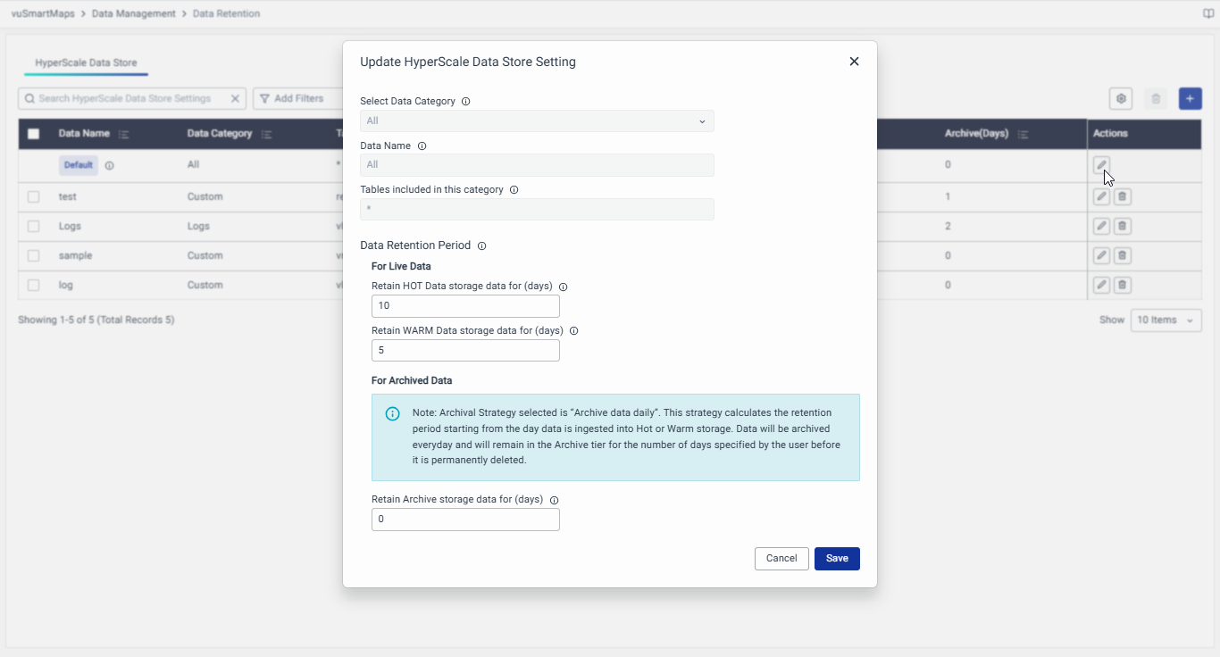 It is to be noted that initially, default retention periods will be set as 15, 5, and 10 days for the Hot, Warm, and Archived data storages.
