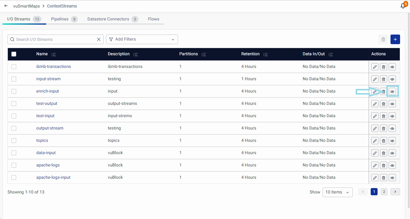 Click on the Preview Data button (available under the Actions column on the I/O Streams page) to preview the data in the particular I/O stream.