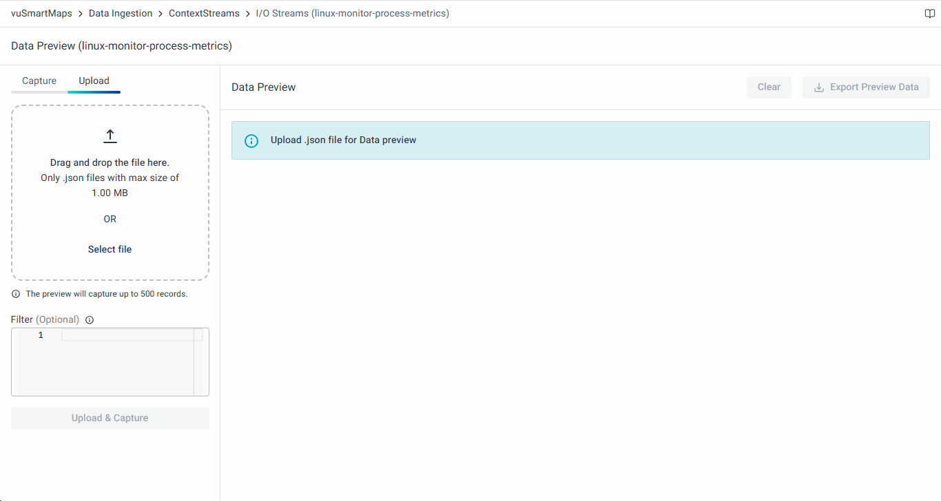 In the 'Upload' tab, users can upload data via a JSON file. After clicking the Upload button, the data preview appears on the right side of the screen. As with the Capture tab, users can export this data using the Export Preview Data button.