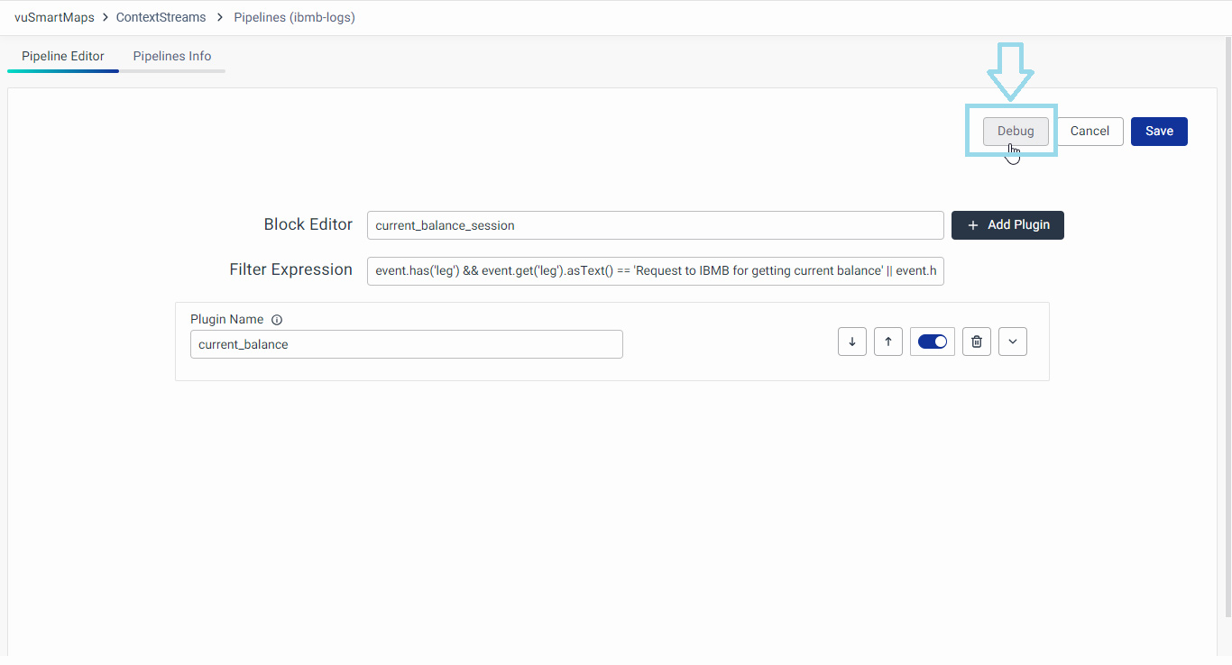 - Click on the Debug button located at the top of the Pipeline Editor page.