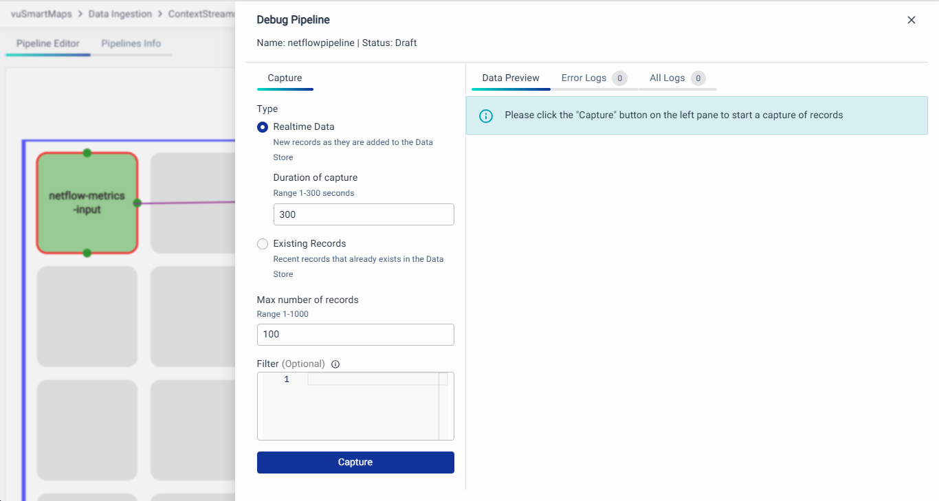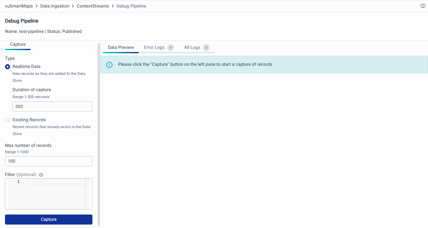 - After providing the necessary details, click on the "Capture" button. During debugging, the system uses actual data arriving at the input of the corresponding pipeline, depending on the configured options on the left side of the Debug page. The data employed in debugging is filtered and processed based on the specified parameters, allowing users to assess how real data would be handled in the pipeline. This approach provides an authentic simulation of real-world scenarios without impacting live ContextStreams.