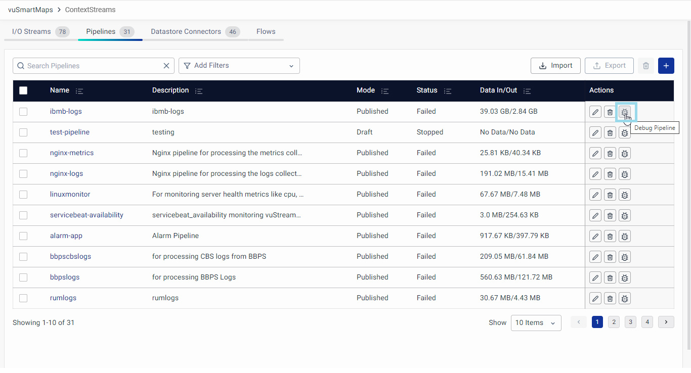 In the vuSmartMaps UI, the Debug option plays a pivotal role in analyzing and diagnosing the functionality of the data pipelines. There are three distinct debugging options available, each serving a unique purpose: