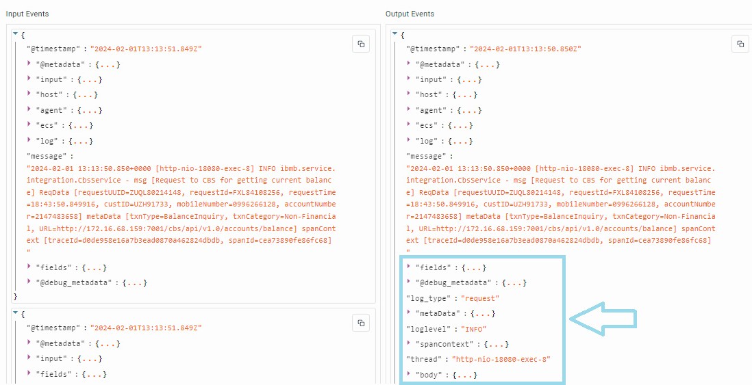 - The Data Preview tab on the right side of the modal will display Input and Output Events. Analyze these fields to ensure that data processing is occurring as expected. If not, make necessary adjustments to the pipeline for proper data contextualization.