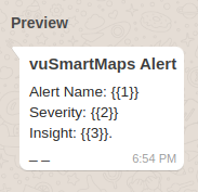 Considering the alert document above, you can substitute the values Enter_Your_Alert_Name_Here, Enter_Your_Severity_Value_Here, Enter_Your_Insight_value_Here in the payload create above with template variables {{Alert-Rule-Name}}, {{severity}} and {{R1>M1>insights}}. (Refer to How to create template variables from alert doc under the SMS message creation section of User Guide).