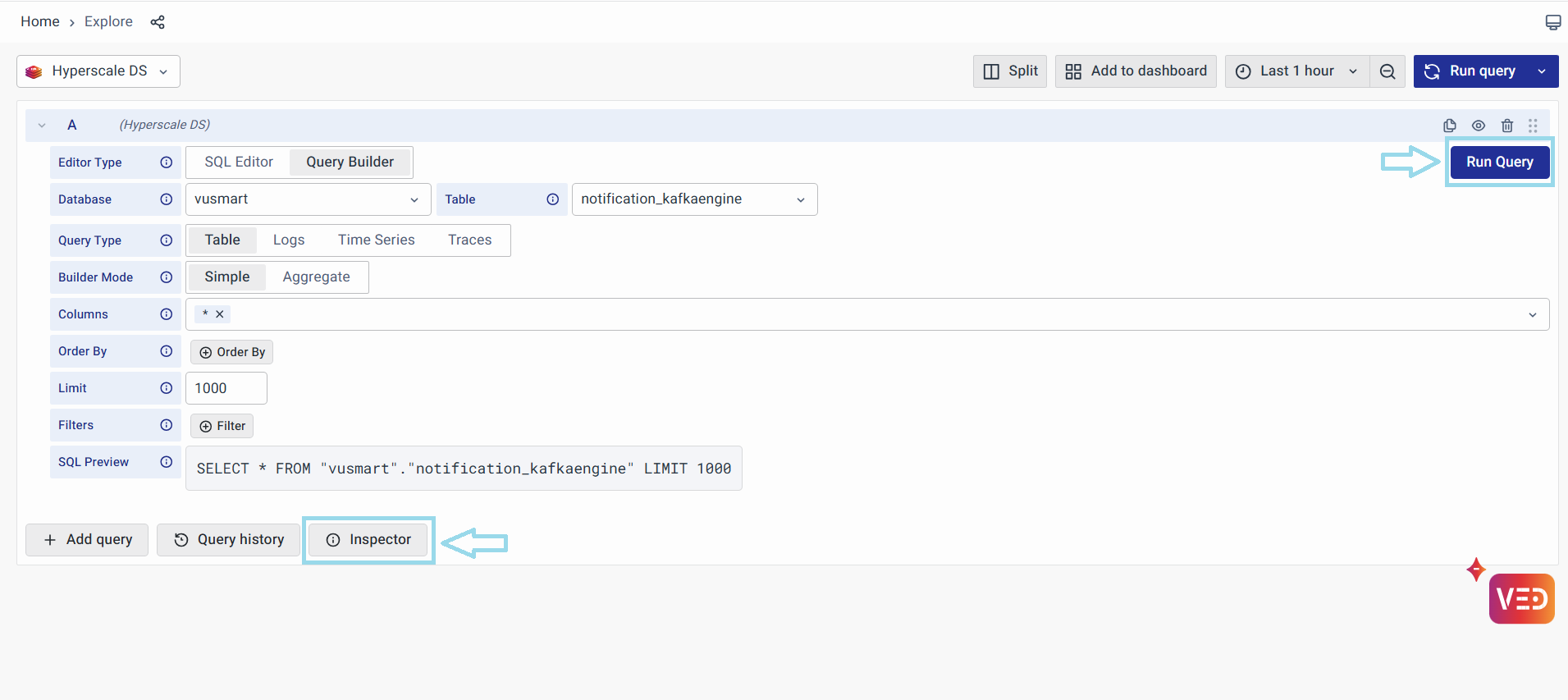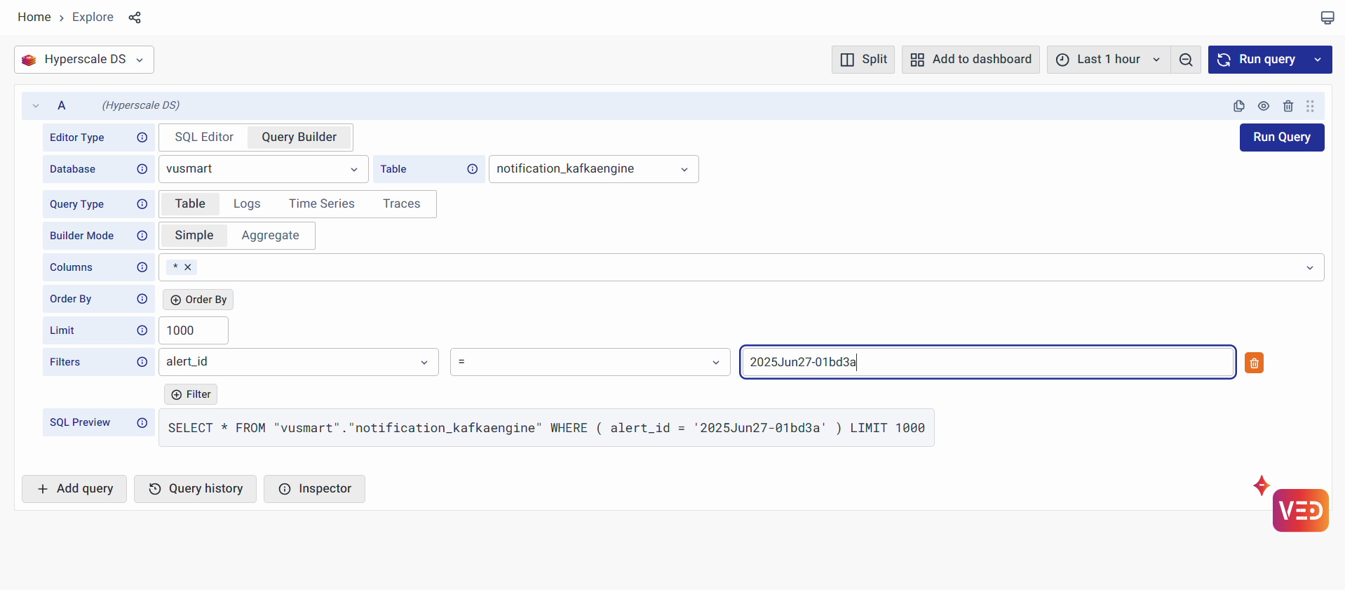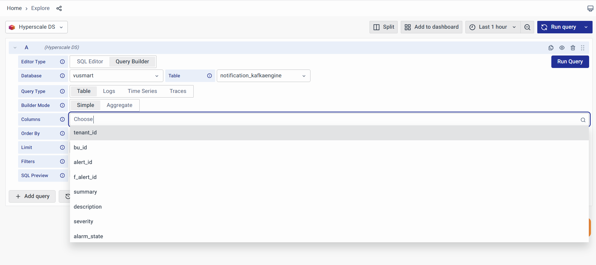 In the Explore panel, start by setting the Editor Type to Query Builder. Then, under the Table dropdown, choose the notification index that corresponds to the alert you want to retrieve.