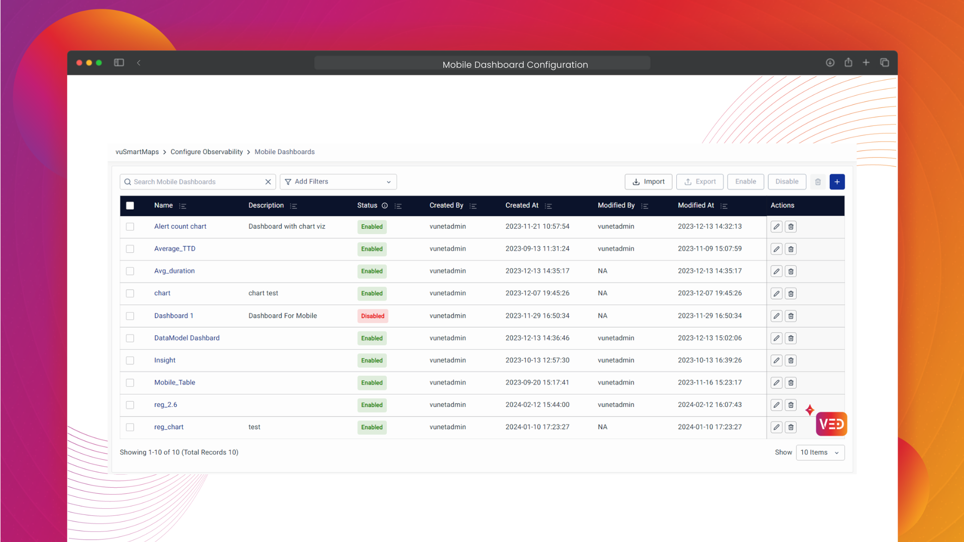 - Easily manage Dashboards with 'Import' and 'Export' buttons.