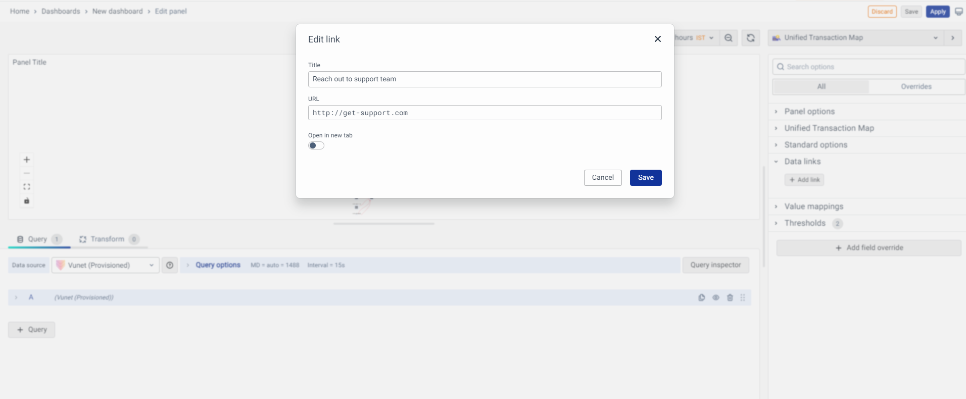 1. Panel Link: Create a link to another website or dashboard. Provide a title, and URL, and choose to open it in a new tab if needed. Click Save.