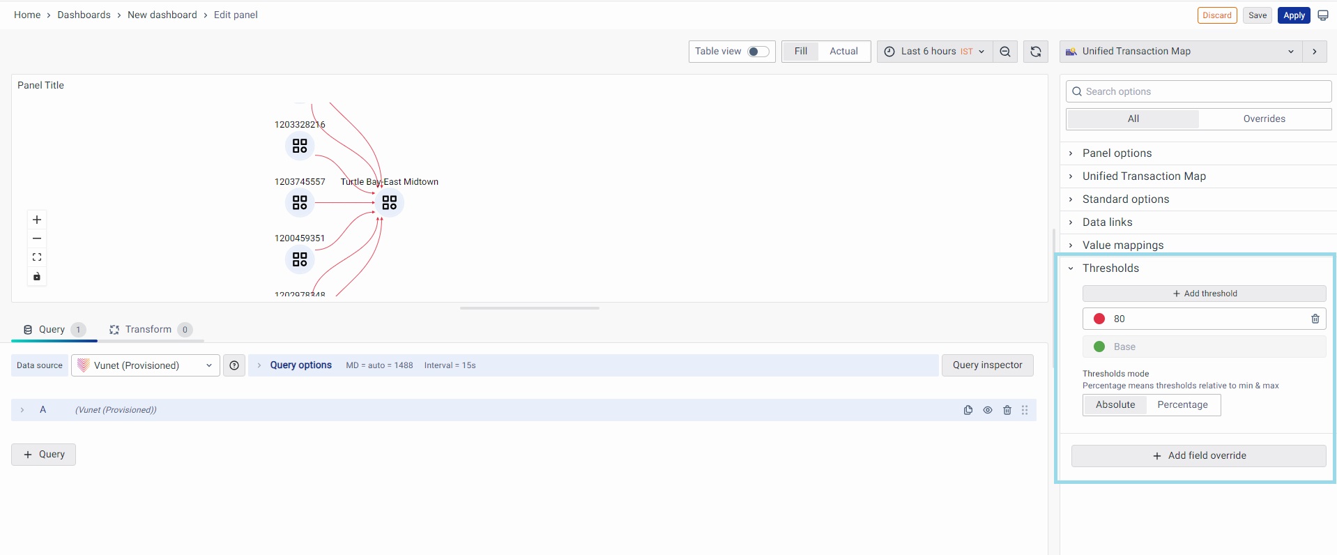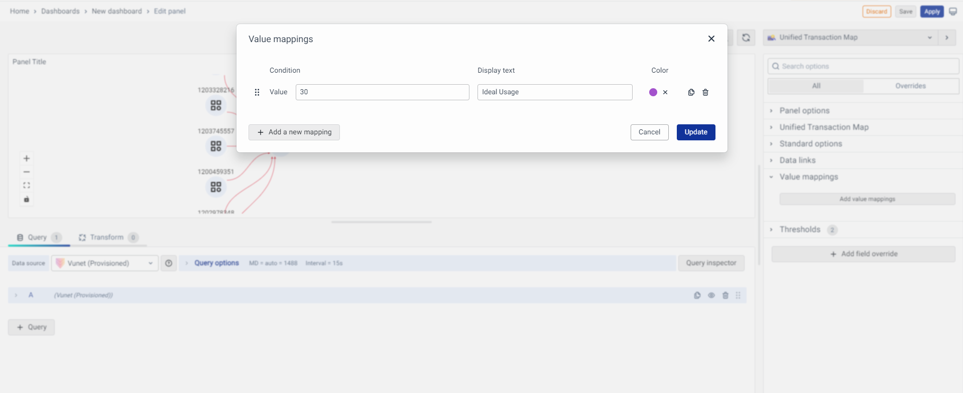 • As Percentages: Assign colors based on percentages. For instance, you can set CPU usage to be green at 0%, blue at 10%, yellow at 20%, red at 30%, and so on. This helps you quickly spot when values exceed thresholds, allowing for immediate action or error alerts.