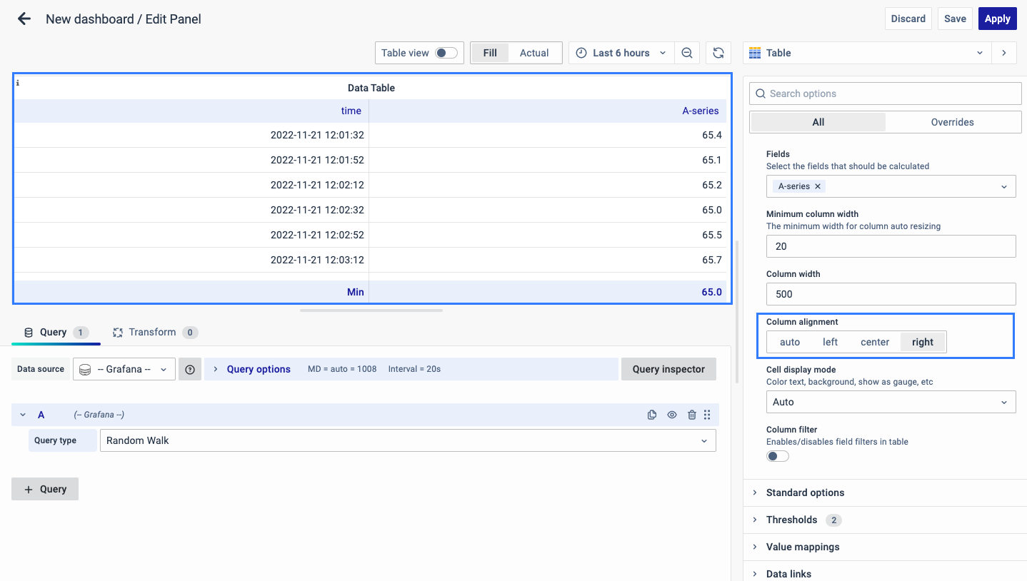 The type of alignment for the column values includes the following options:
