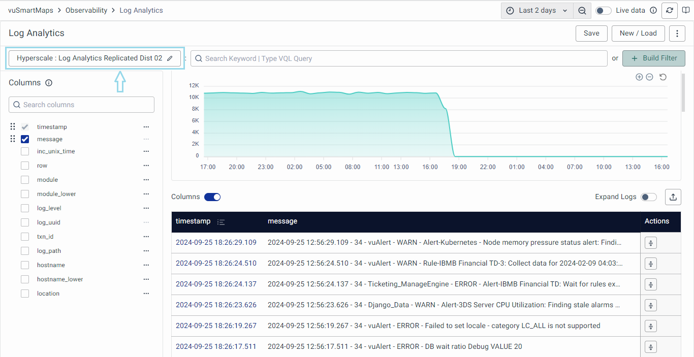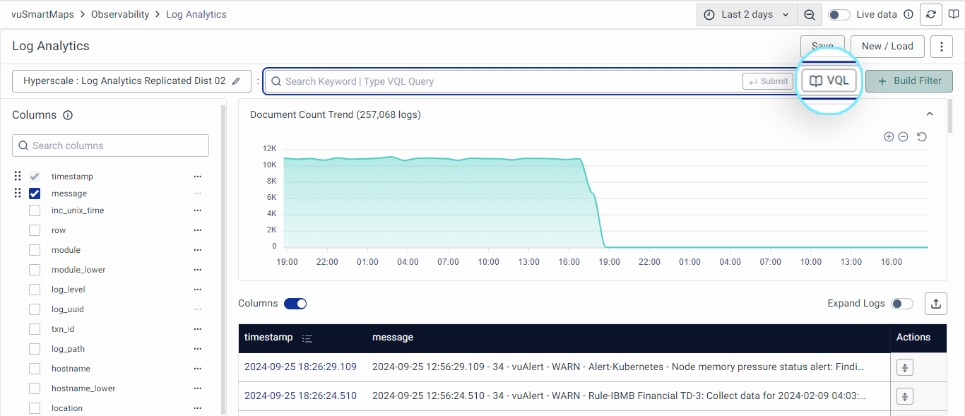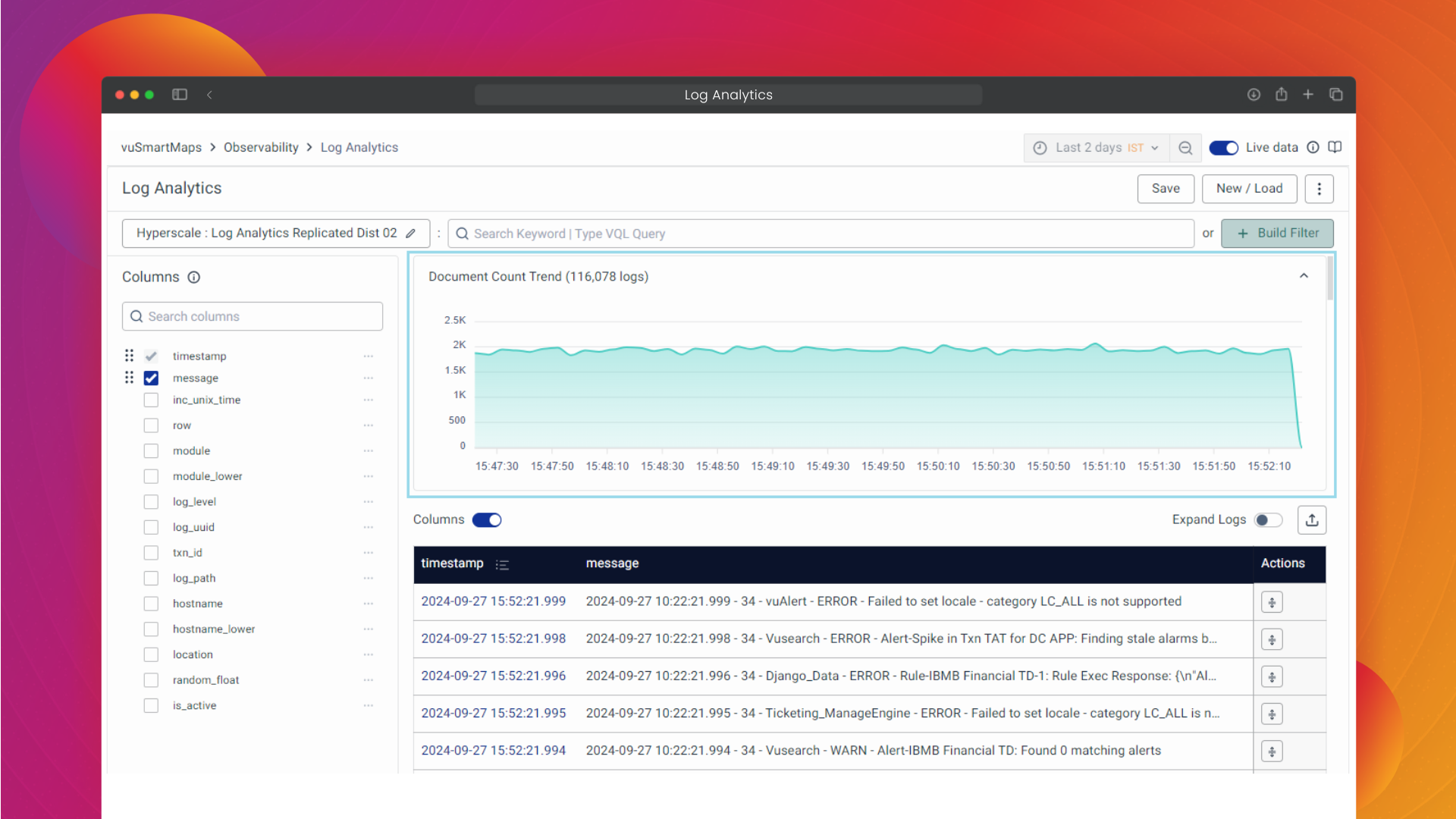 To streamline querying, Log Analytics features Vunet Query Language (VQL), enabling users to build complex queries quickly and conduct precise, effective searches. This combination of features allows for rapid root cause analysis (RCA) within seconds, driving faster issue resolution and minimizing downtime.