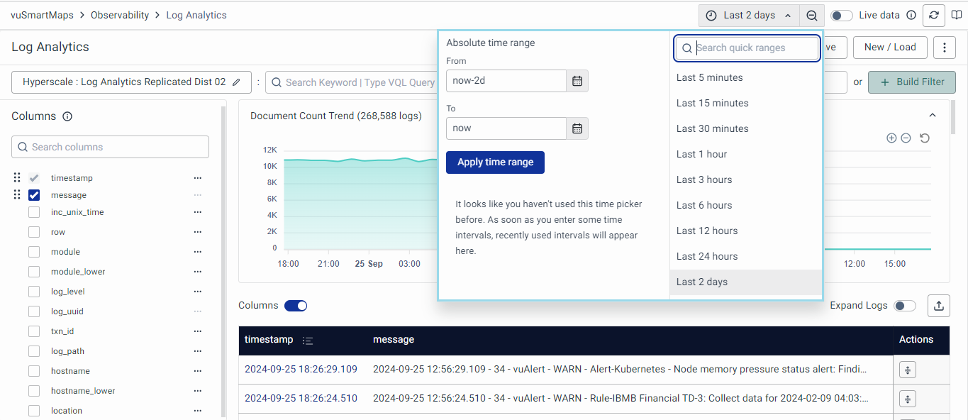 - At the top right corner, you’ll find the global time selector, allowing you to gain insight into the logs at a specific time range selected.