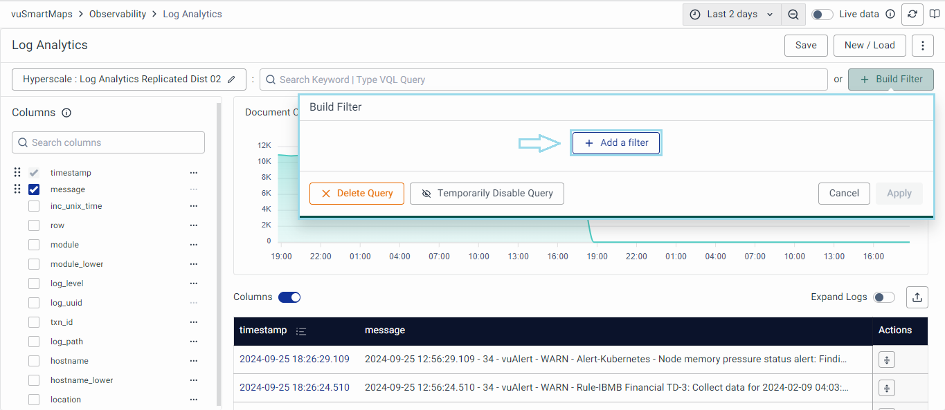 The Build Filter option located next to the search box allows you to add filters. By clicking 'Add Filter,' you can select columns and operators to filter out specific logs in the table.