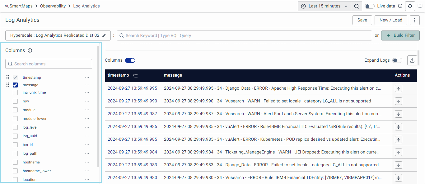- The Columns option on the left enables you to choose which columns are displayed in the Table. By default, the ‘timestamp’ and ‘message’ fields are selected on the Table.