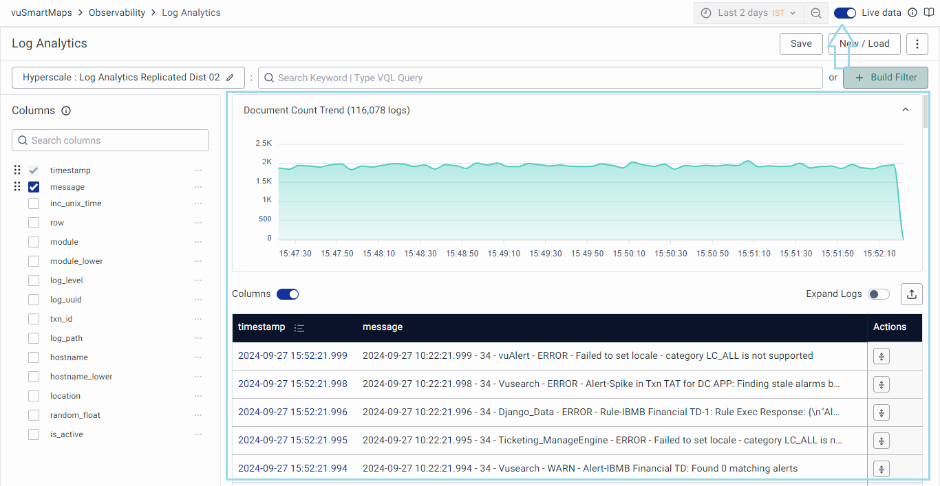 - Alternatively, if we toggle the live data, it will showcase the latest 500 records from the last 5 minutes.