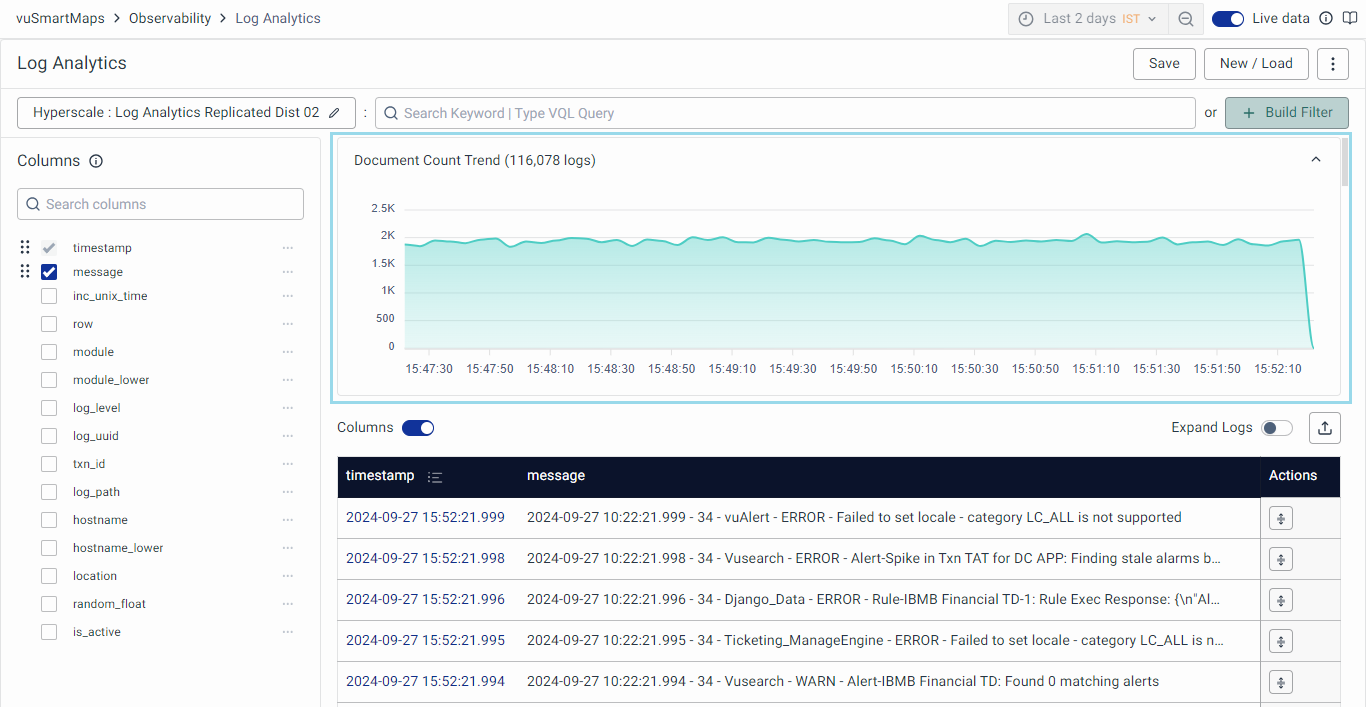 - Using VQL-based Text Queries in Search Bar: You can enter VQL (Vunet Query Language) based text queries directly into the search bar to retrieve specific logs matching your criteria.