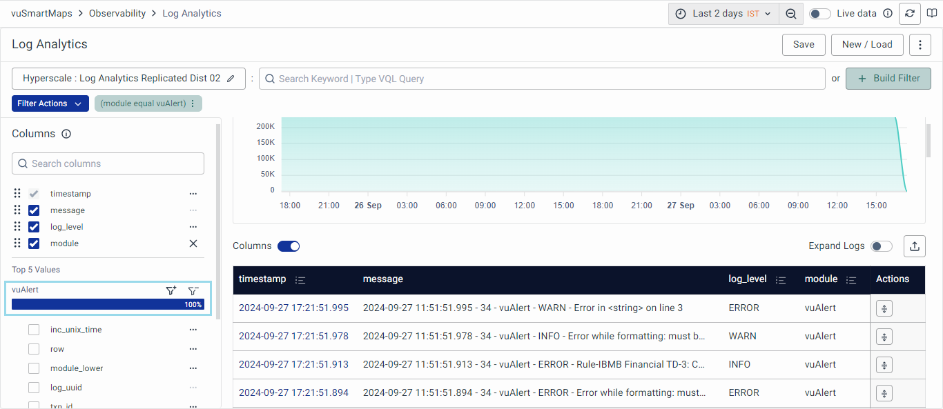 - Filter for value: This allows you to show the filtered value in the columns. For instance, if you want to filter ‘vuAlert’ in the module field, you can click on the Filter for value option.