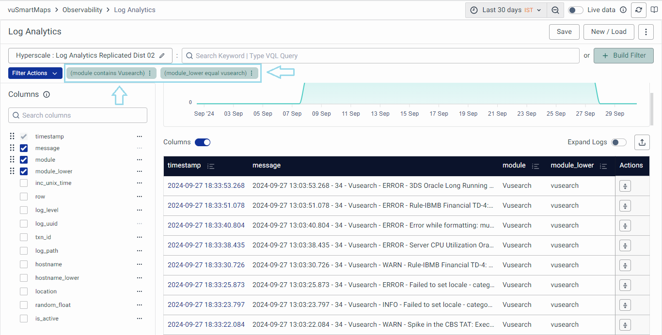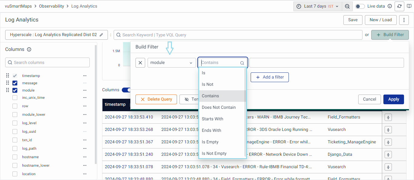 - For instance, you can search a string-type field such as 'module', choose the operator 'Contains', specify the term as 'Vusearch', and then click on Apply.