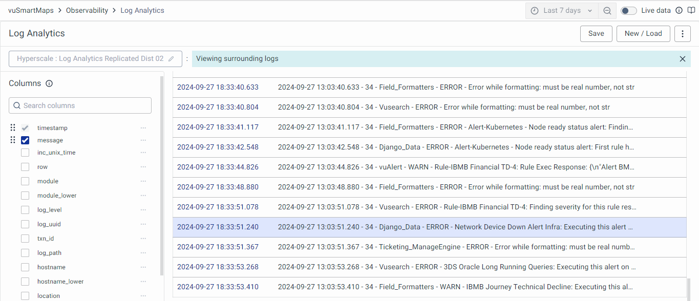 - Additionally, in surrounding logs, you can’t add or edit any filters. Please be aware that any changes to columns selected to be shown on the table from the left side will not be preserved when returning to the main page from the surrounding logs view.