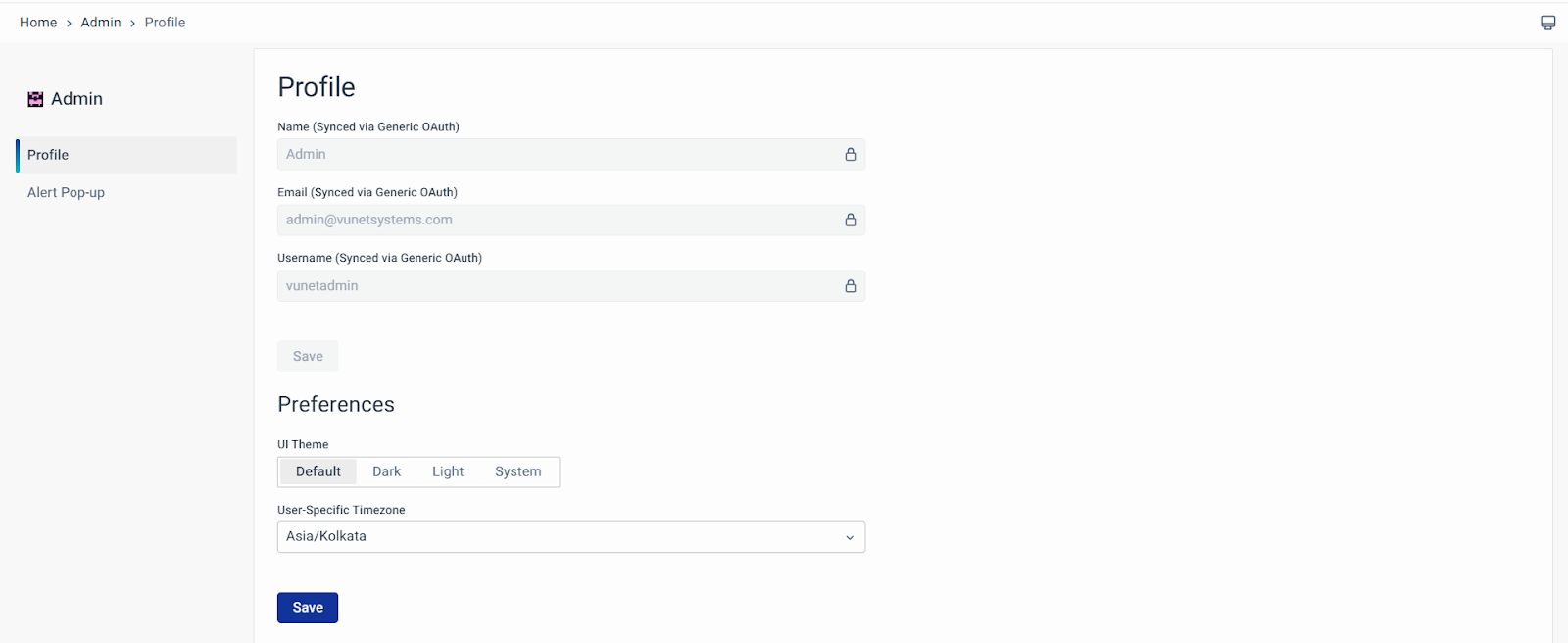 Navigate to the Admin section at the top right corner of your screen and click on the Profile section. select Alert Pop-ups to open the user-specific settings modal.