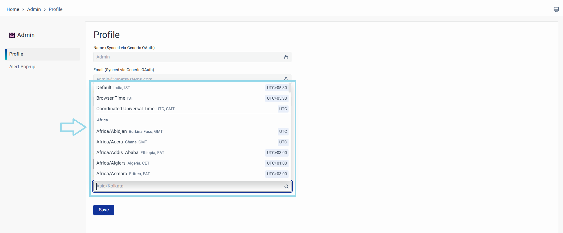 Select your desired timezone from the User Specific Timezone dropdown menu, and the system will update to reflect the chosen timezone.