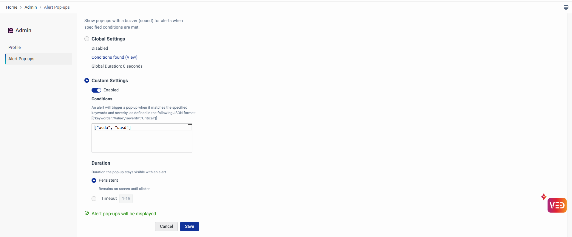 - Click on the Save button to apply these configurations, a toast message will confirm "Alert Pop-Ups configuration updated!".