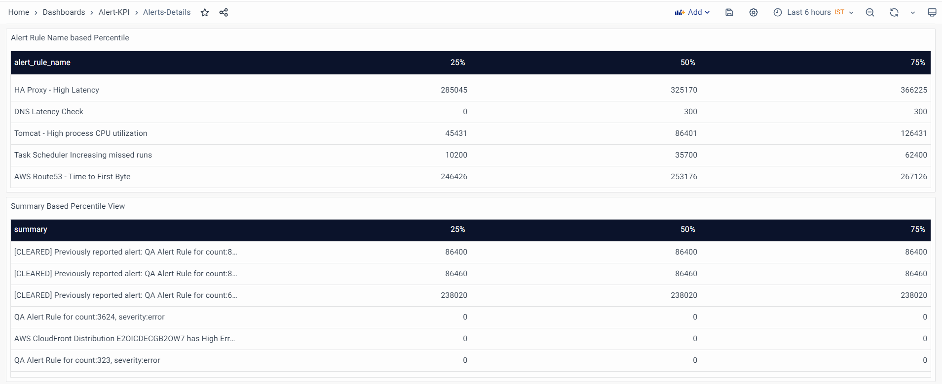 Summary-based Percentile View: A statistical view providing percentiles (e.g., 25th, 50th, 75th) of alert occurrences based on alert summaries or descriptions. It offers insights into the distribution of alerts based on their content or nature.