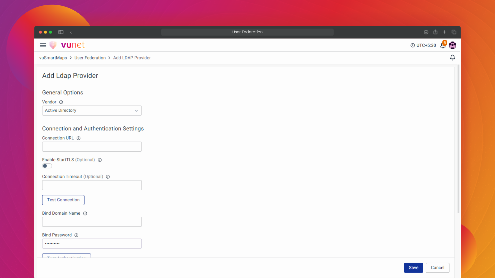 To integrate LDAP with vuSmartMaps, navigate to Platform Settings > User Federation, click + New Provider, and select LDAP. Fill in the required connection details including vendor, connection URL, bind DN, and bind password. Then configure the domain name and mapping settings. Use the Test Connection and Test Authentication buttons to verify setup before saving.