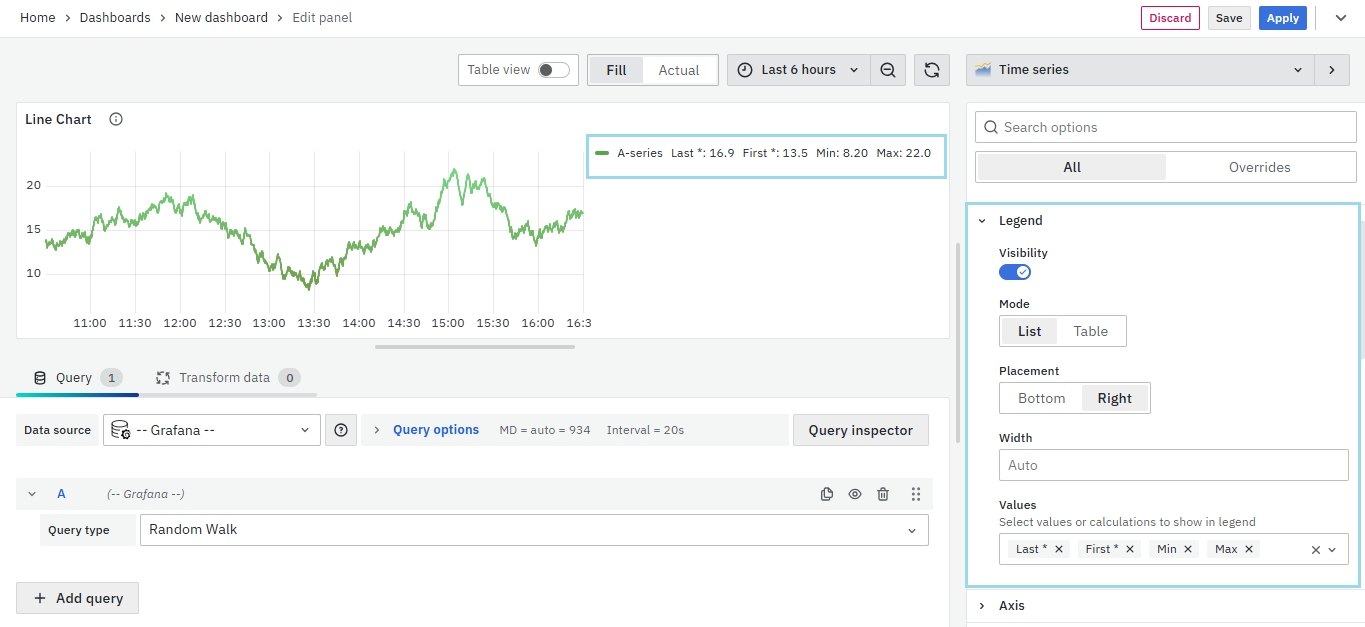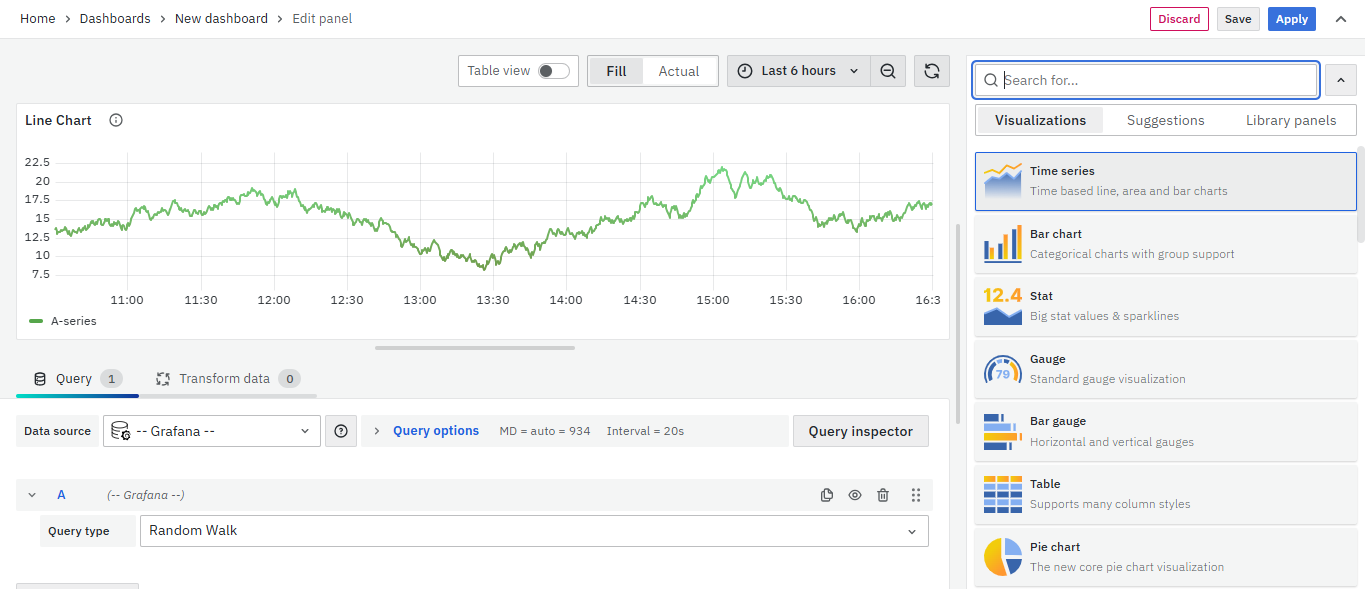 On the right side of the default screen, select Visualization as Time series to create a Line Chart panel.