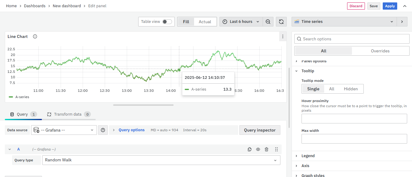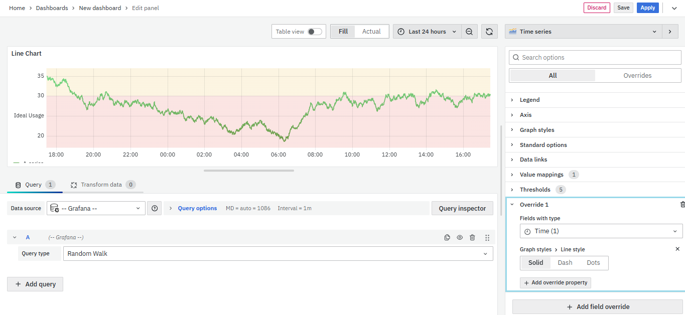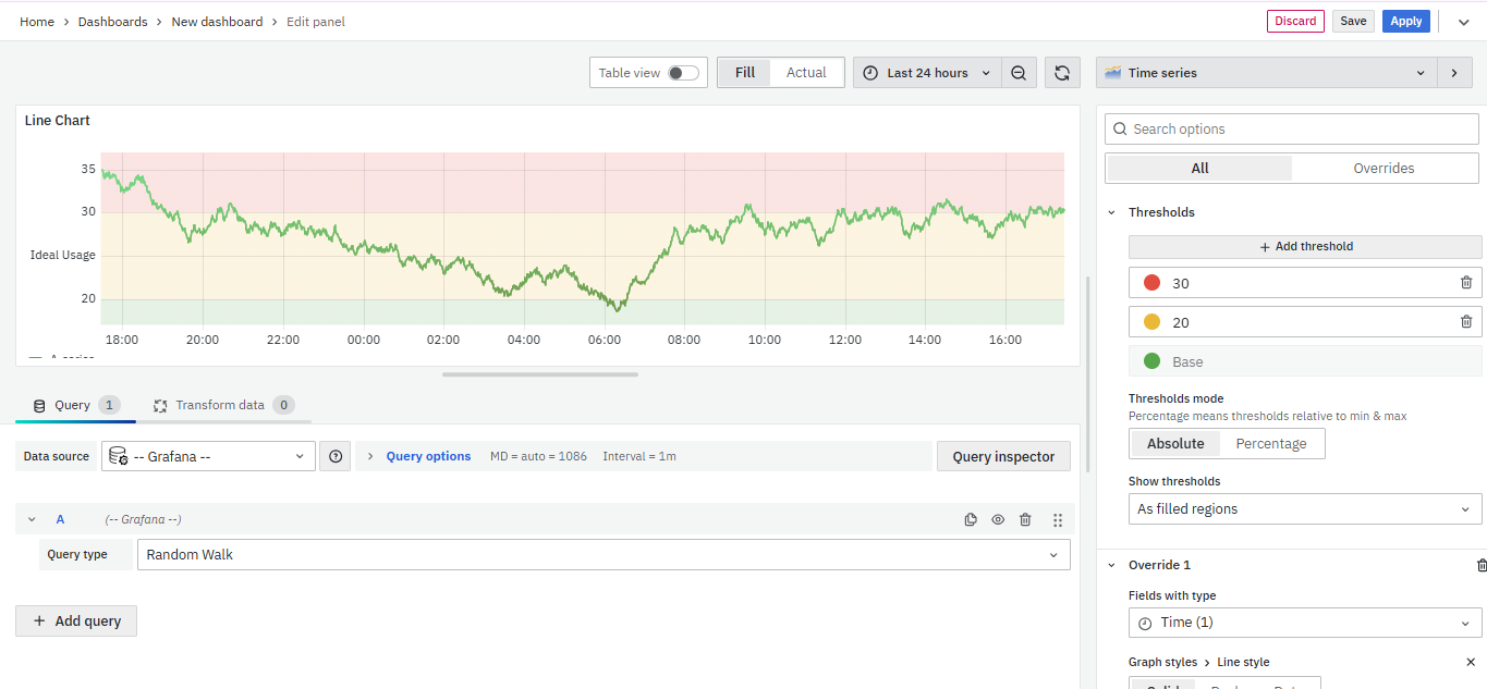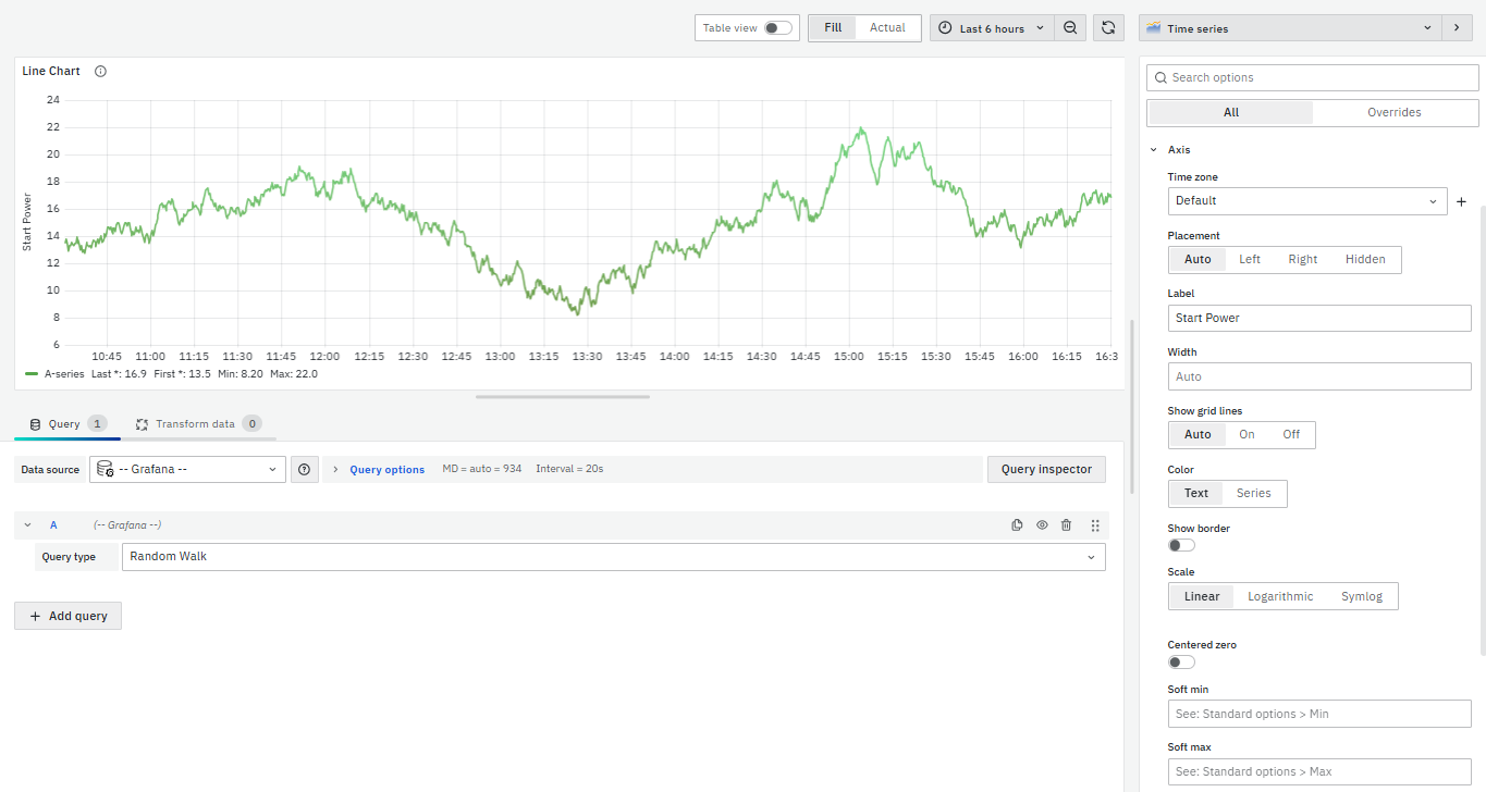 - Select Visualization → Choose Time Series to create a Line Chart panel.