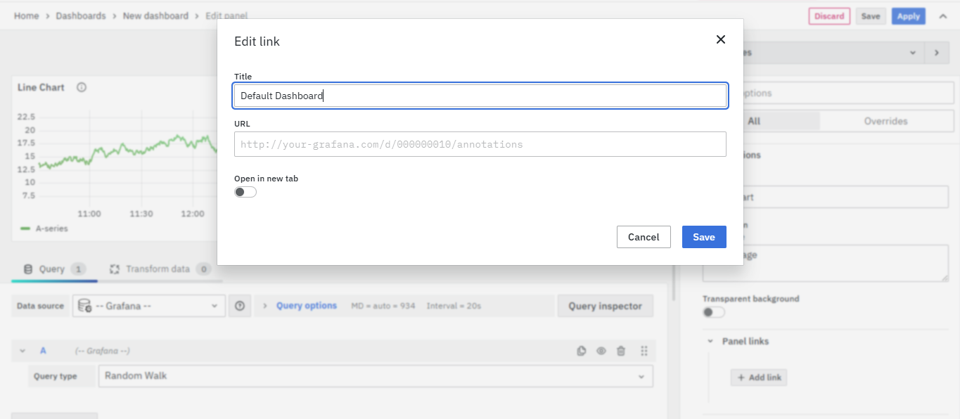 The URL can be a link to another dashboard or for getting help or useful info. When you click on a panel, it opens the link either in the same tab or a new tab, depending on your choices. For example, if you want to compare a default dashboard, just click the link to open it.