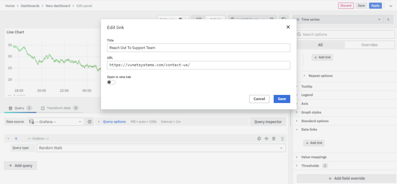 The next part of Panel Options is Panel Link where you can point a link to any other website or dashboard of your choice. Enter a title, and URL and select the ‘Open in a new Tab’ option if you want to open the link in a new tab. Click Save.