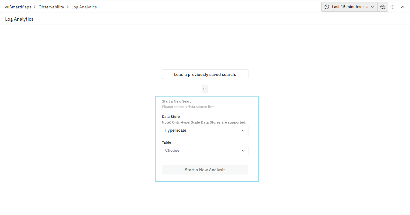 - To visualize the log data, start by selecting the Data Store and Table you intend to analyze from the dropdown menu, and click on the Start a New Analysis button.