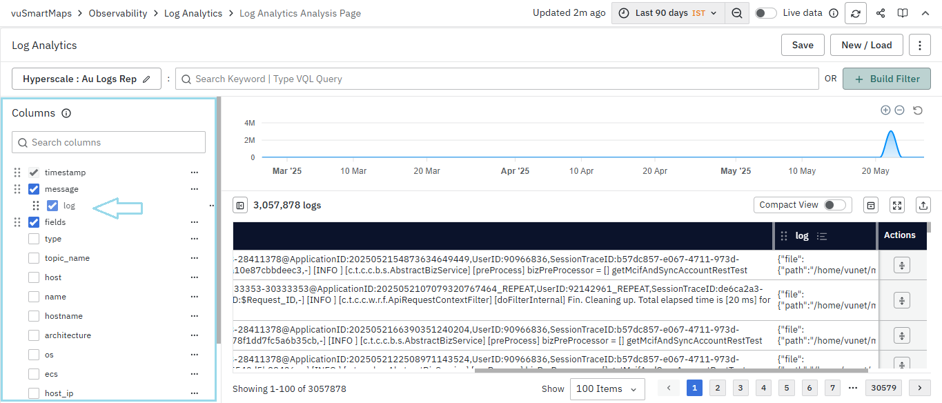 The Columns toggle allows you to control the visibility of the sidebar. By default, the sidebar is visible when the page loads unless there is a specific reason to hide it. The Columns toggle lets users hide the sidebar. This feature offers flexibility for those who prefer a more streamlined view of the logs without the column options sidebar.