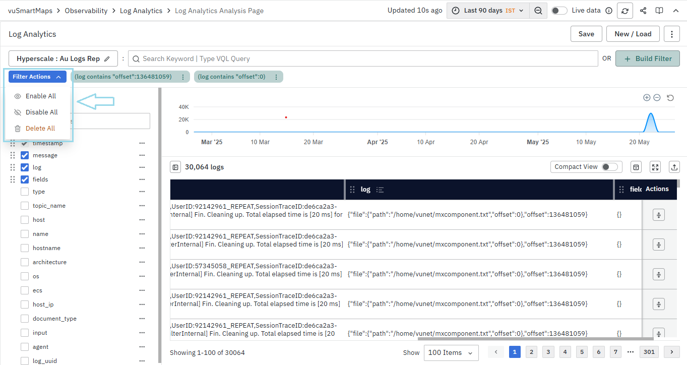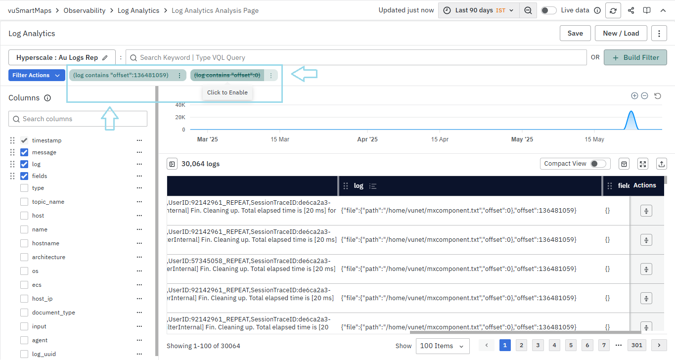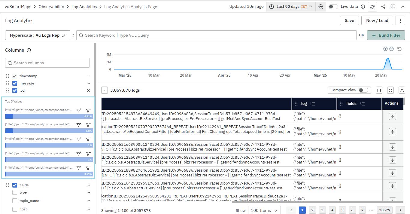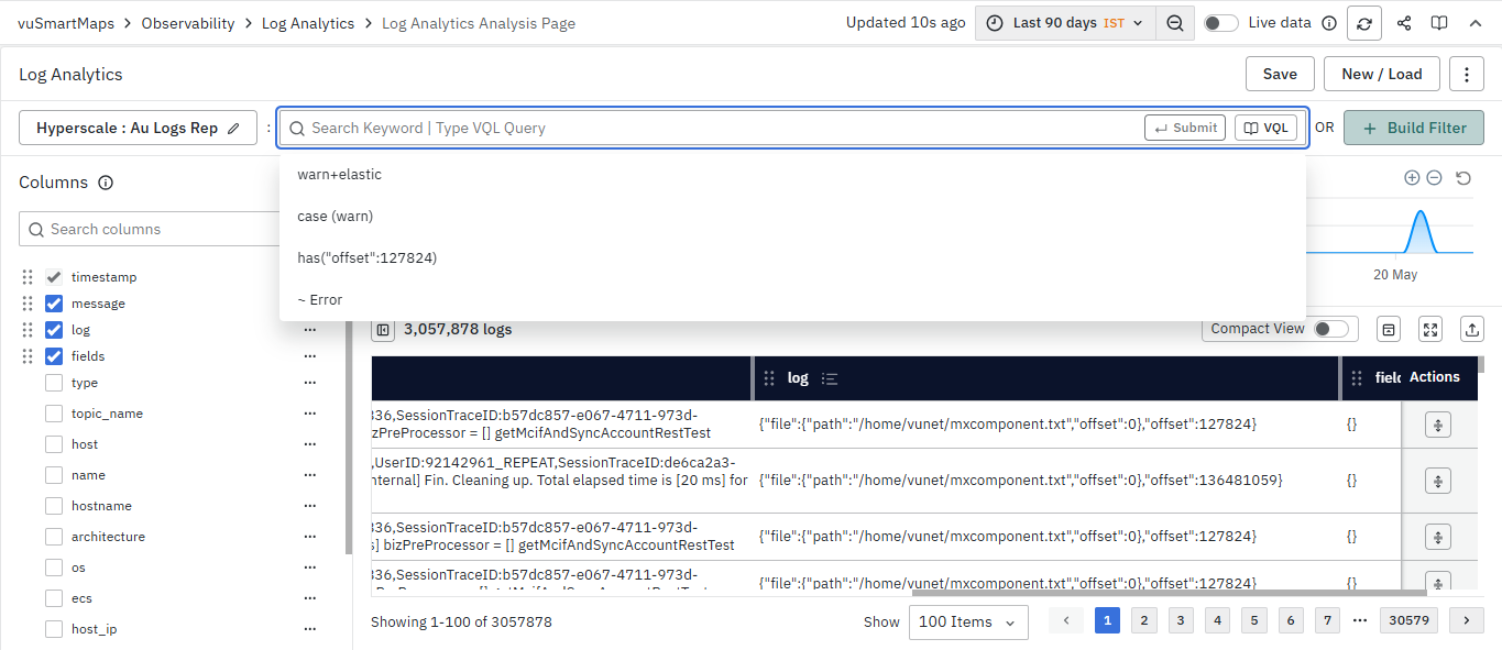- Using VQL-based Text Queries in Search Bar: You can enter VQL (Vunet Query Language) based text queries directly into the search bar to retrieve specific logs matching your criteria.