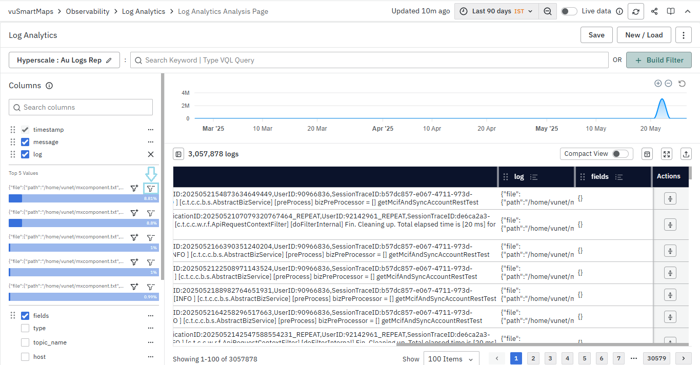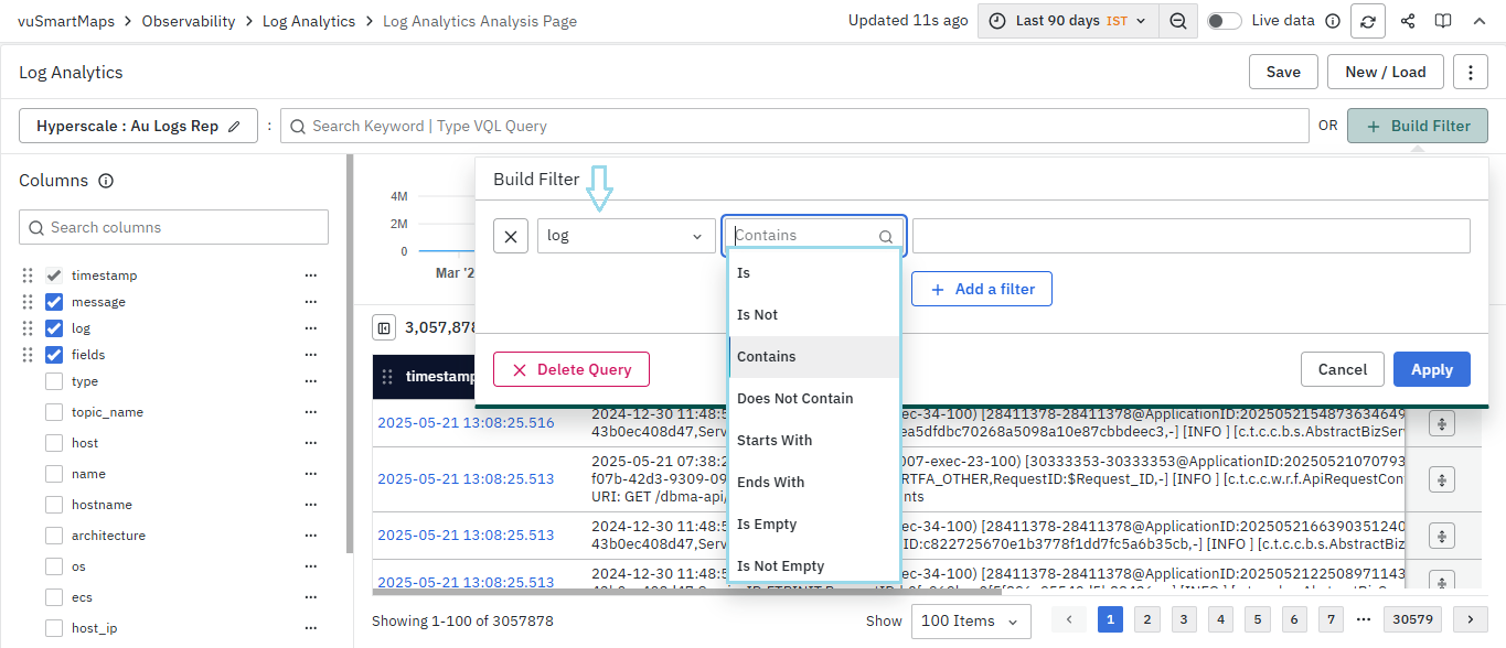 - For instance, you can search a string-type field such as 'log', choose the operator 'Contains', specify the term, and then click on Apply.