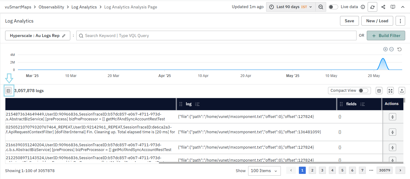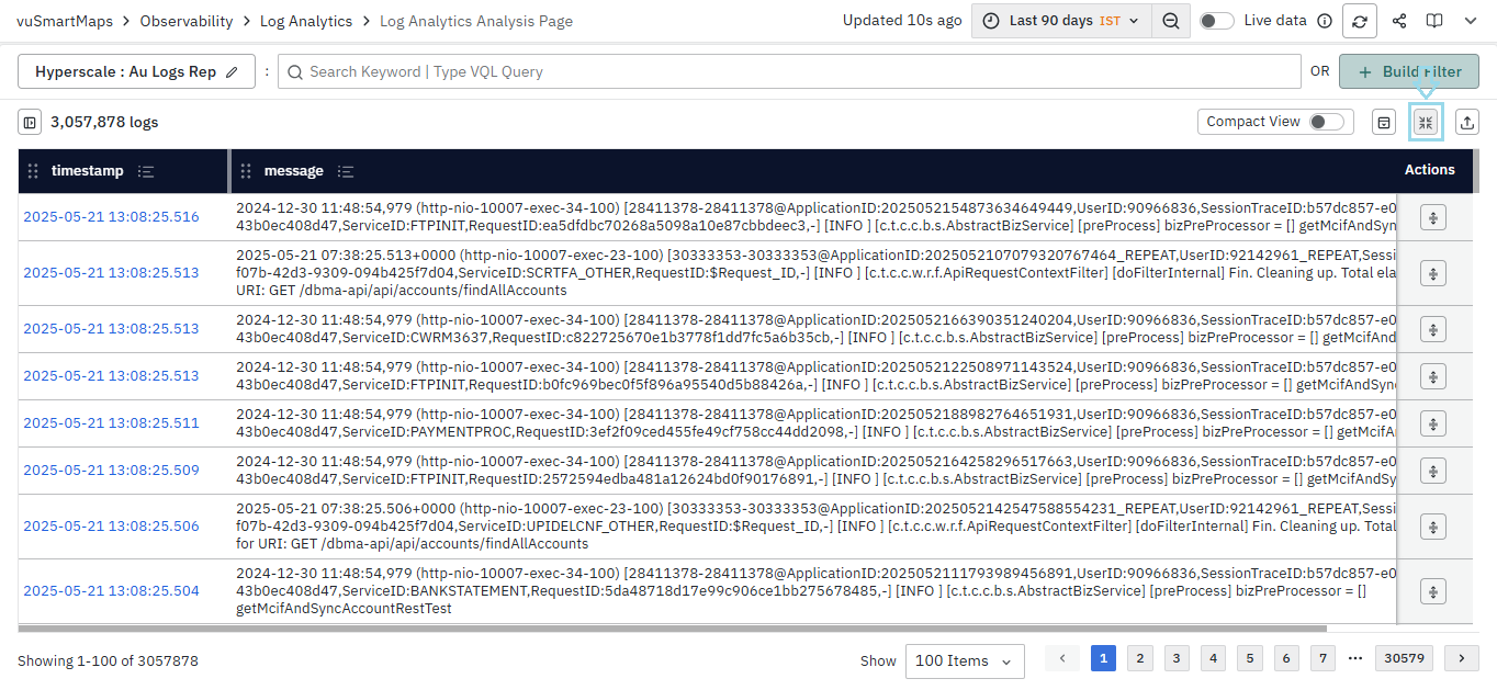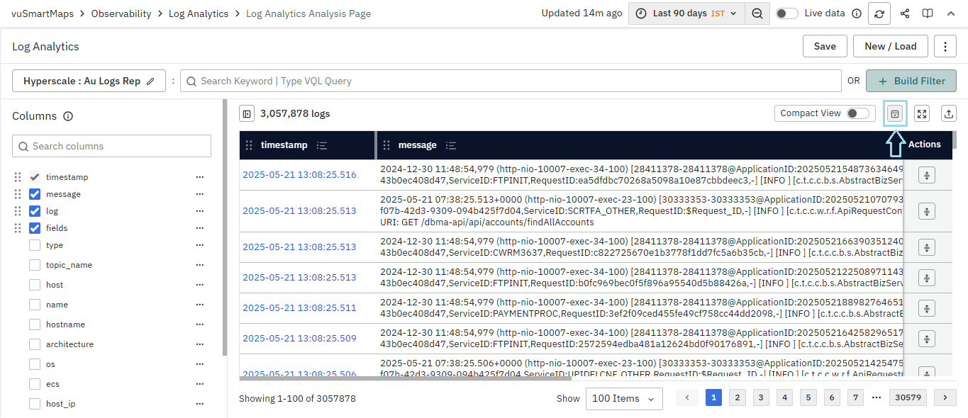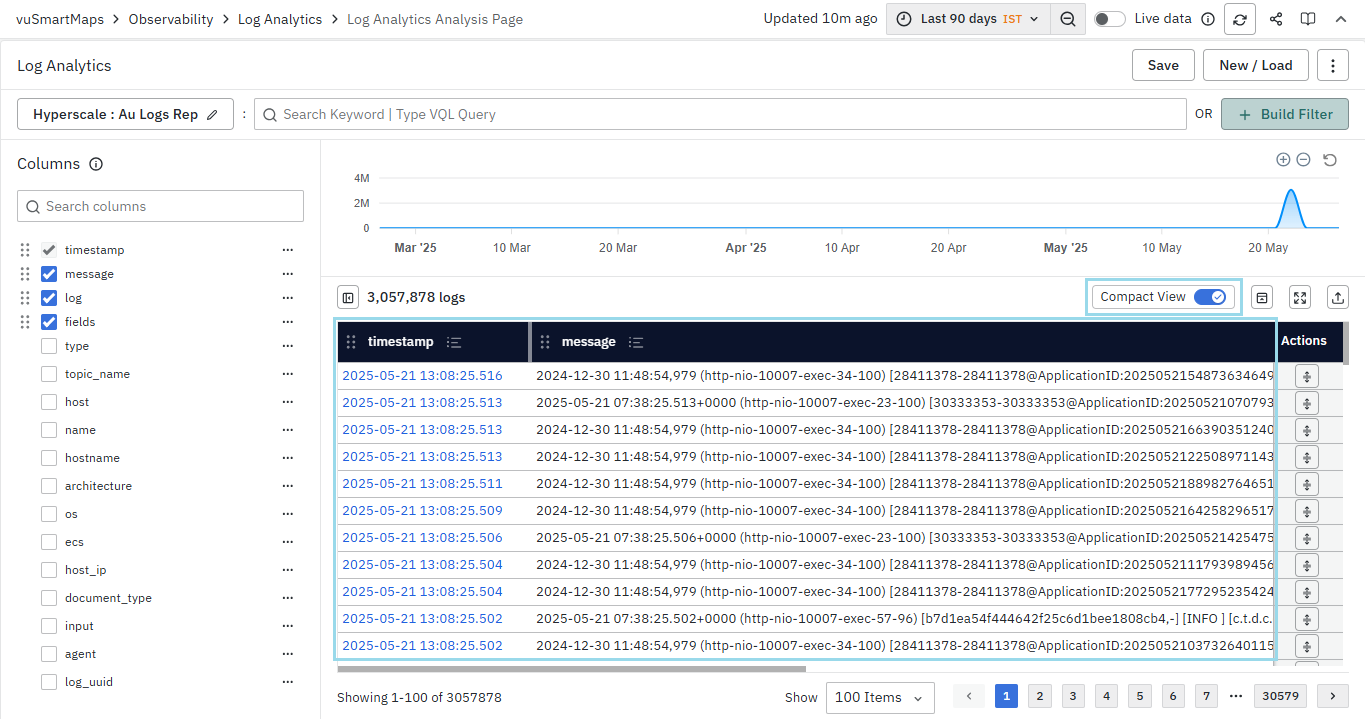 - Multiline data, such as log messages, is displayed within cells by default, with a maximum of eight lines shown per message. However, messages longer than approximately eight lines may be truncated for readability. When the Compact View toggle is enabled, messages are flattened into a single line, offering a more concise and space-efficient layout.