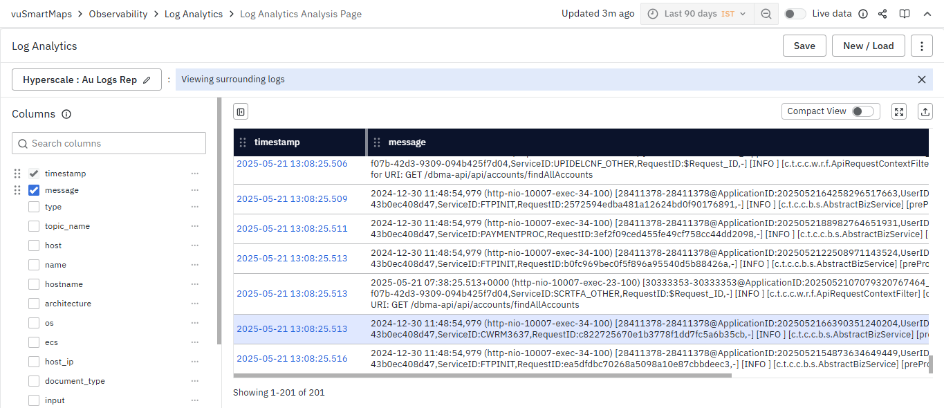 - Additionally, in surrounding logs, you can’t add or edit any filters. Please be aware that any changes to columns selected to be shown on the table from the left side will not be preserved when returning to the main page from the surrounding logs view.