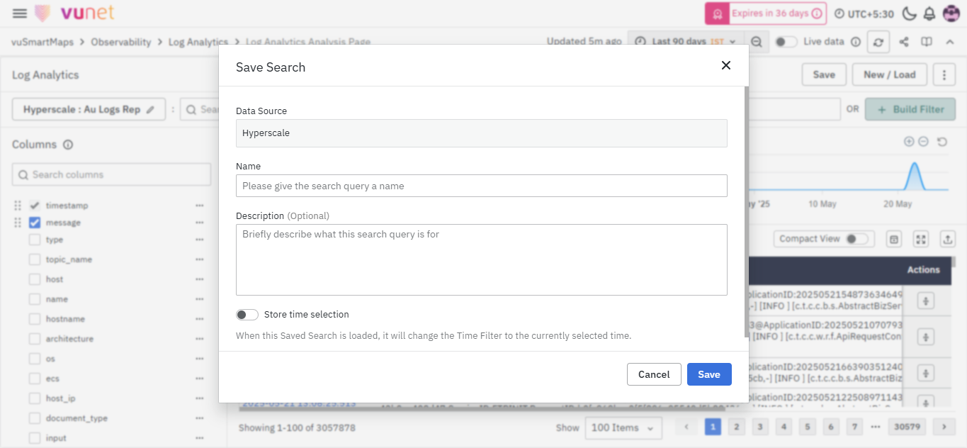 - When you click the Save As button, a pop-up will appear. Add the name and description (optional), and you can toggle Store time with Saved Search, which saves the search with the selected time. Whenever that search query is opened, it automatically sets the saved time range by default and loads the logs for that time range.