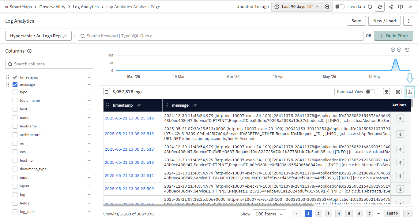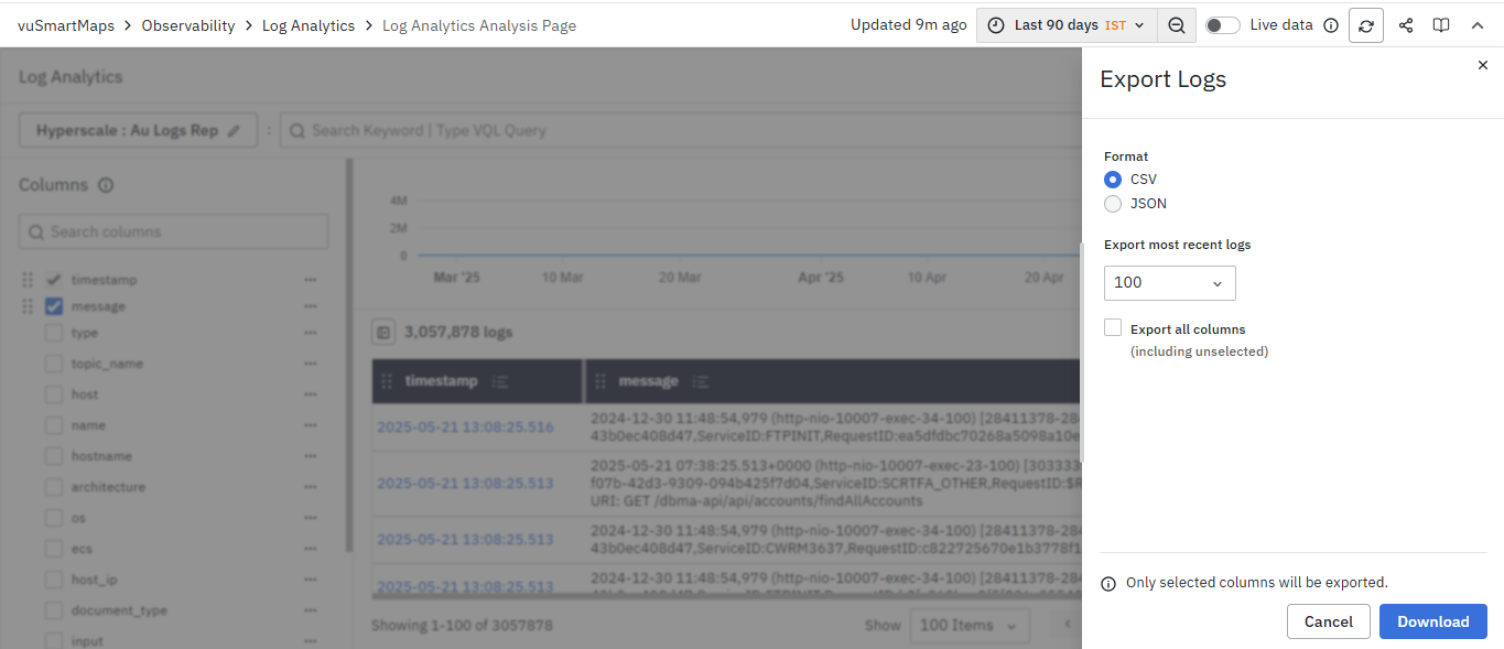 - On clicking the export button, a screen will appear where you can download the logs in CSV and JSON format with a maximum limit of 5000. Alternatively, you can also select the log limit to 100, 500, or 1000. Once done, click on the download button to download it to your local system.