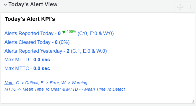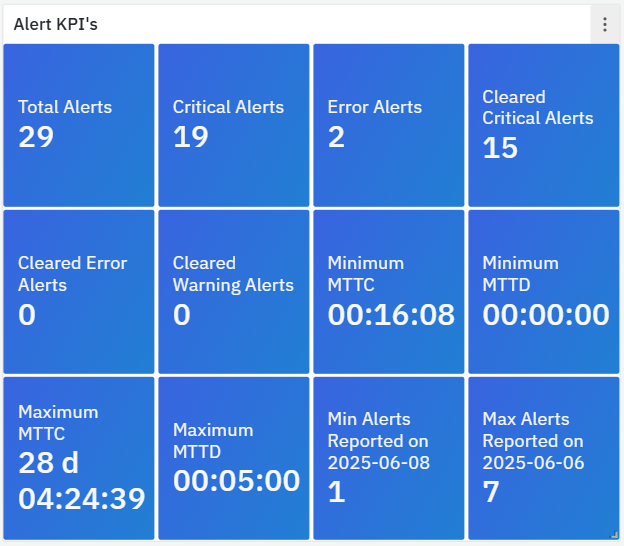 • Displays key performance indicators such as the total number of alerts, cleared alerts by severity (Critical, Error, Warning), and time metrics like the minimum and maximum Mean Time to Clear (MTTC) and Mean Time to Detect (MTTD).