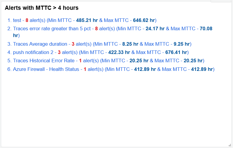 • Highlights alerts with a Mean Time to Clear (MTTC) greater than 4 hours, indicating which alerts took the longest to resolve.