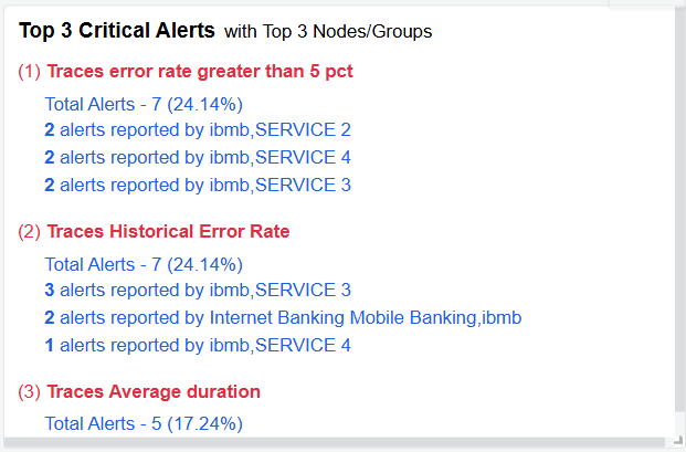 • Shows the top three critical alerts and identifies the top three nodes or groups where these alerts are most frequently reported.