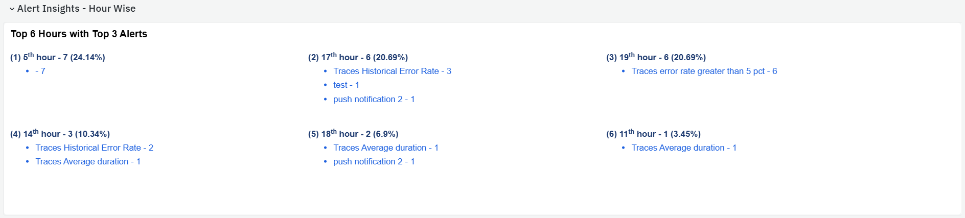 The Alert Insights - Hour Wise panel provides a breakdown of alert activity across different hours of the day, helping teams identify peak times for alert generation and focus their monitoring efforts more effectively.