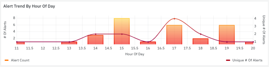 • This line and bar chart shows the distribution of alerts by hour throughout the day. It provides insight into peak alert hours, helping teams anticipate and prepare for times of higher activity.