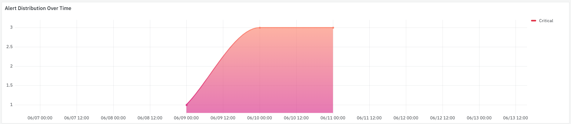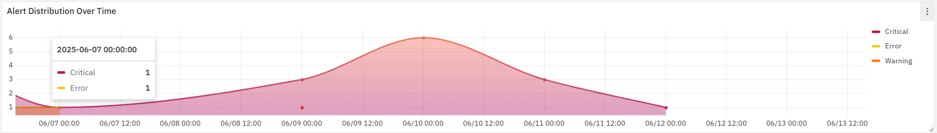 • This area chart visualizes the distribution of alerts over a selected period, segmented by severity (Critical and Warning).